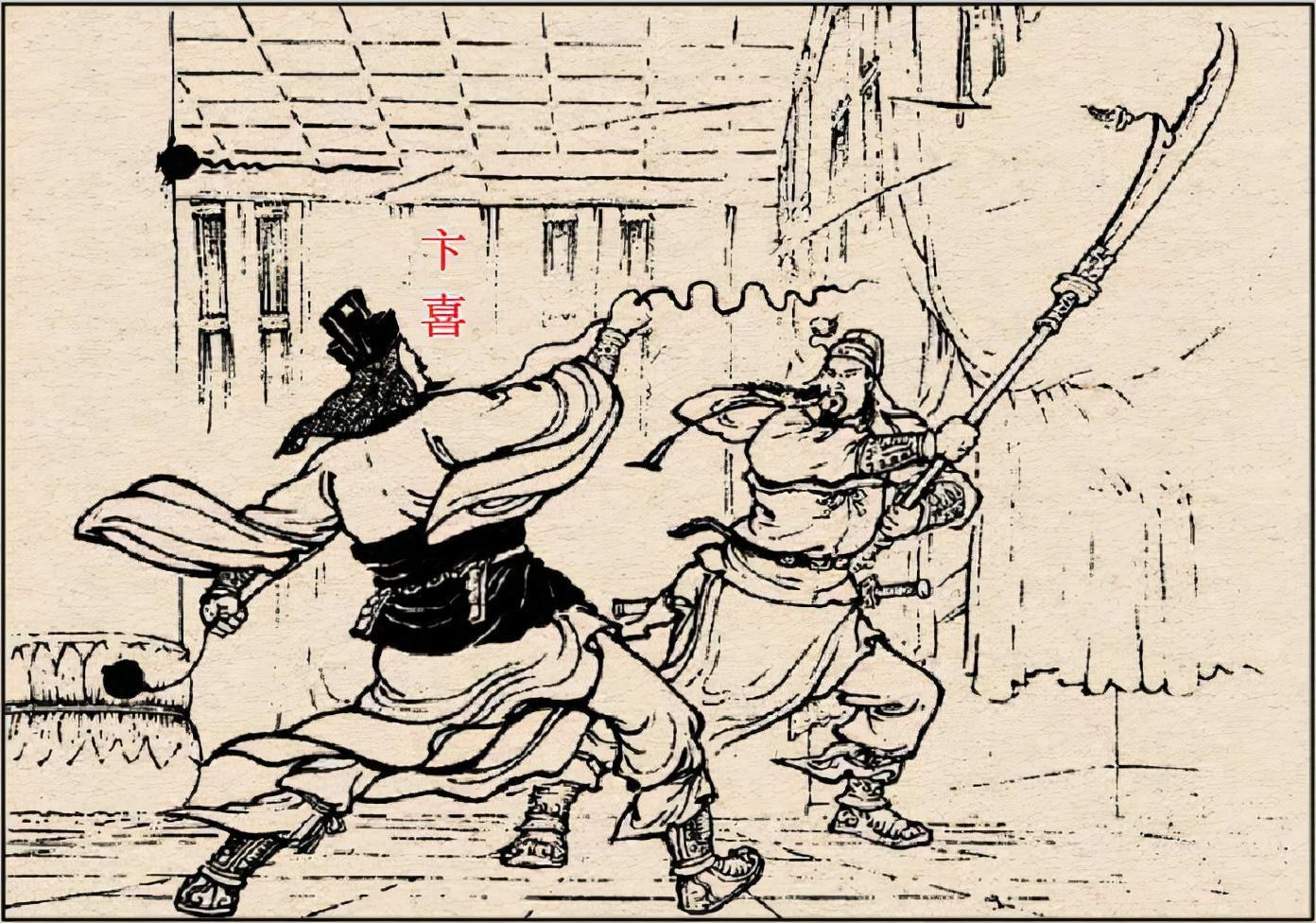 卞喜,黄巾军余孽,洗白后镇守汜水关,并摆设鸿门宴加害关羽。计谋泄露后,卞喜用流星锤碰瓷青龙刀,被一刀斩断而飞。