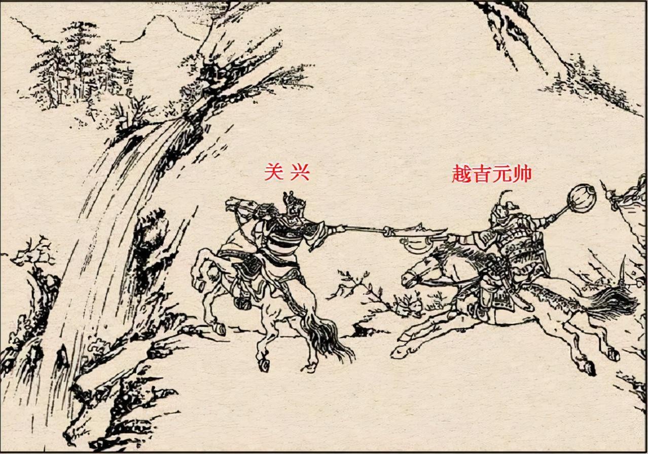 西羌越吉元帅,善于使用铁车阵,曾经大破蜀军并乘胜追击,一锤把关兴打落水中(坐骑被打死)。次日再战,铁车阵失陷,越吉元帅仓皇而逃,遭遇奔袭而来的关兴,被一刀斩杀。