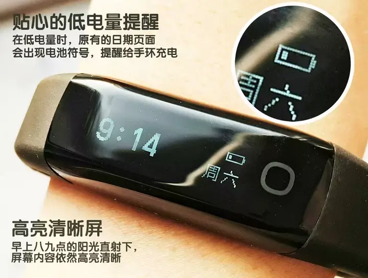 最后笔者惊喜的发现,全新的大屏幕除了优质的高清亮屏不怕烈日晃眼之外,还可以贴心显示低电量提醒,从此用乐心Mambo2,手环何时该充电也了然于心!