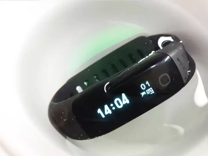抱歉放之前忘记拍照,所以动图是放入的摆拍敬请见谅。实际测试从13点半放入水杯,14点翻开手环,露出小圆点轻触依然可以切换屏幕,只是沾水不太灵敏。