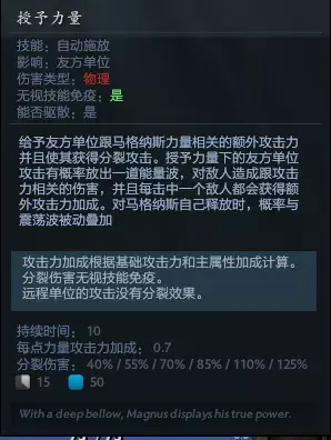 残暴熊怪的一技能可以将自己与另一个单位连接,被连接的单位提升小额的力量,并使其造成的所有魔法伤害转化为物理伤,转化率100%,附加部分力量。