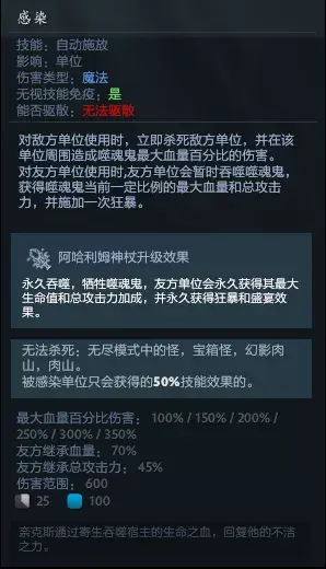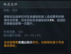 夜魇近战,近战单位攻击时根据目标血量,获得伤害加成,每降低5%获得8%加成(满级) ,夜魇远程,远程单位获得200%爆伤加成。