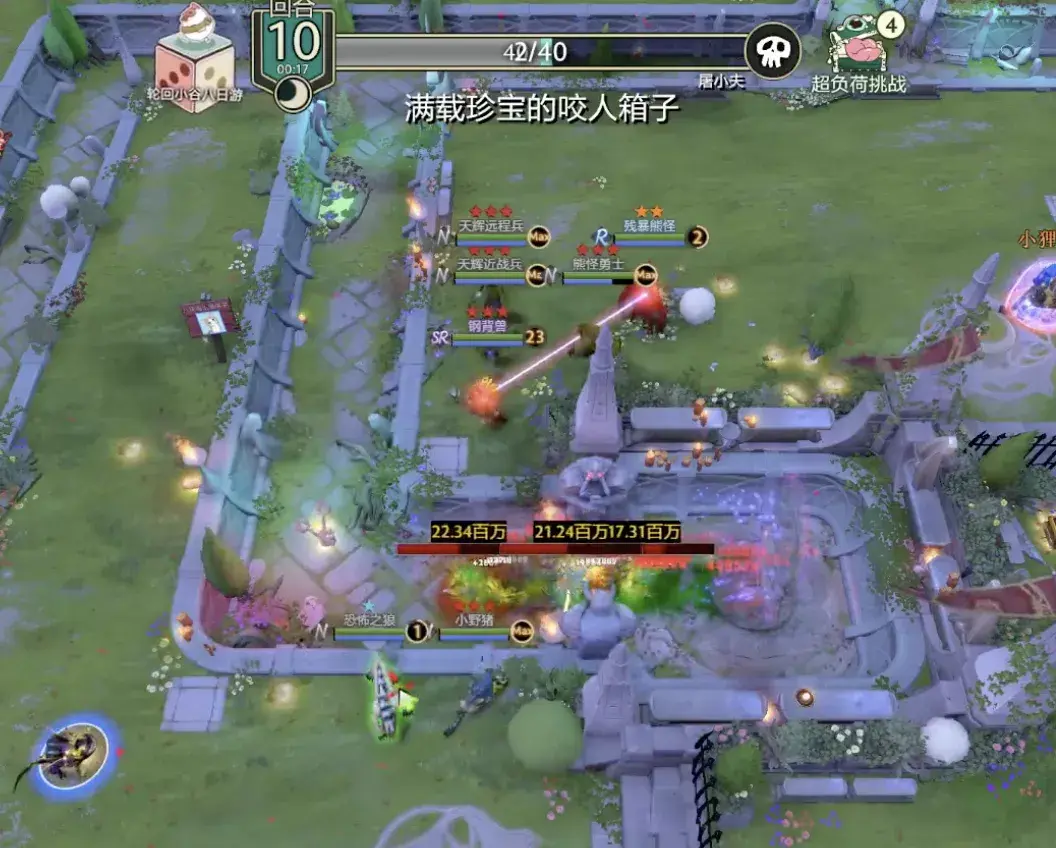这个阶段或者更早的时候,英雄升到3星,有钱了自然是补3星装备了,部分英雄的3星关键装是A杖(阿哈利姆神杖),比如小鹿。其他英雄对A杖的优先级就没有那么高了,甚至于没有A杖效果。因为前期缺乏攻速的关系,对依赖普攻频率来输出的英雄来说灾劫之星是个不错的选择,而15波的钱箱也是单个怪不需要考虑3级的大狂战。然后就是把身上的装备能升级的都升一遍,等着打钱。如果这个阶段你发现怪基本上秒死,那么可以考虑继续拉高超负荷的等级了。这个阶段最起码是2级超负荷,稍微顺一些都可以直接4级拉满了。