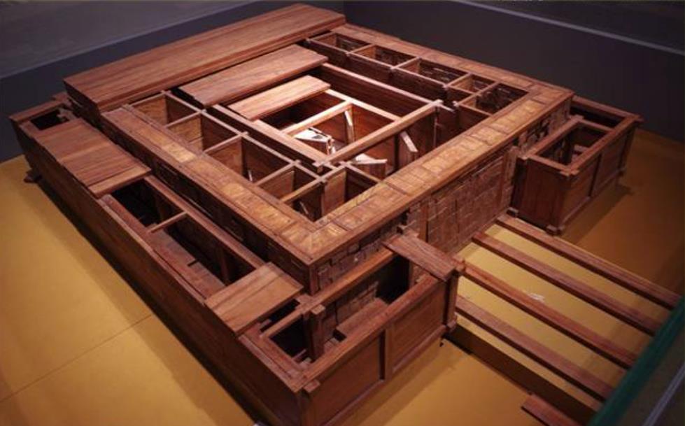 黄肠题凑的建造方式大概是在棺椁的周围用特定的木头筑起四道墙将棺椁包围住,在在上面盖上盖板,这样就成了一个类似于房子外形的模样。