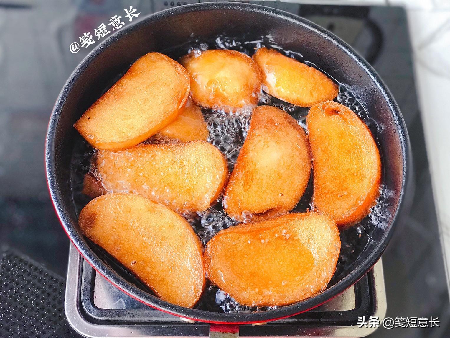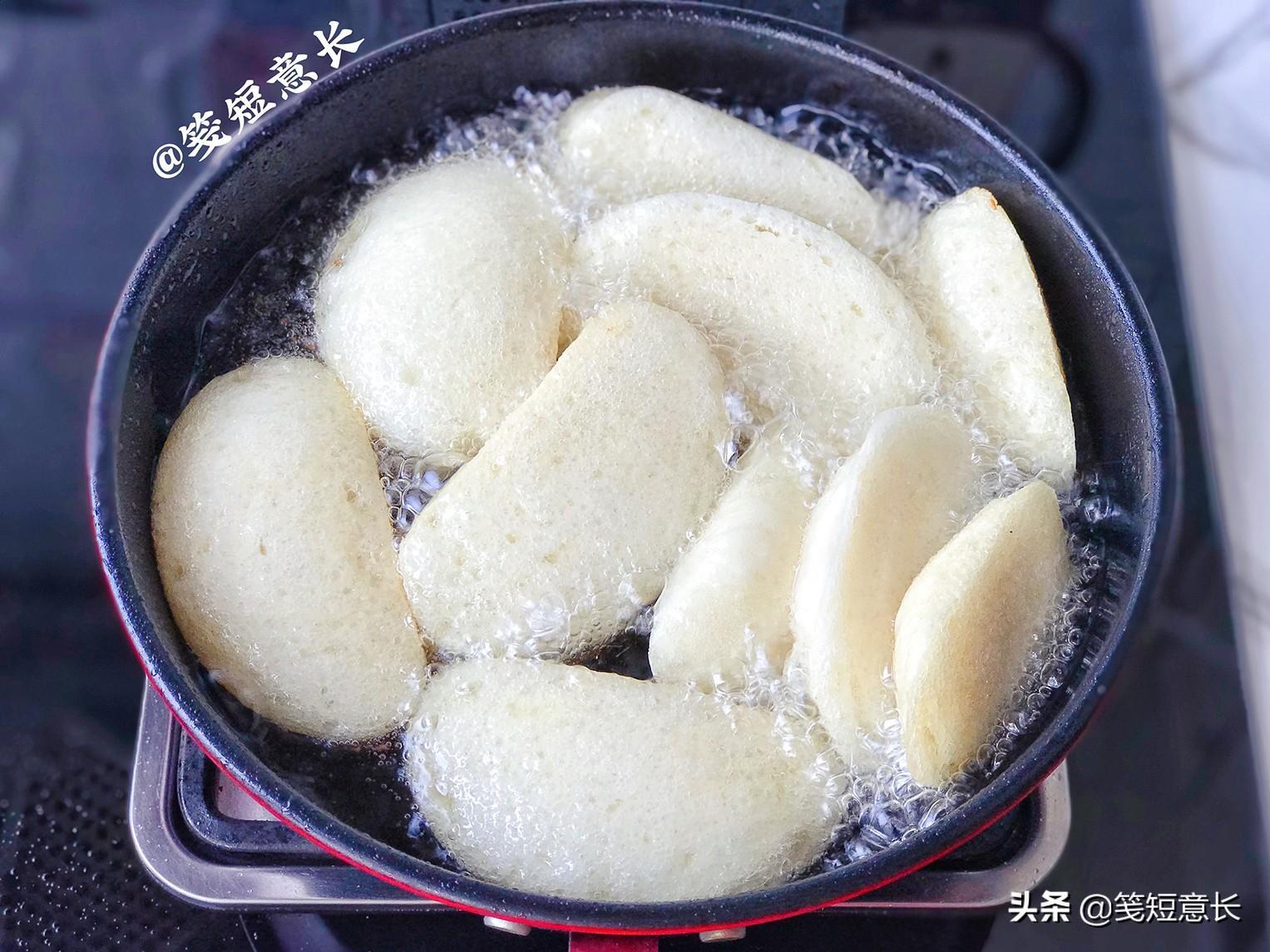 5、因为馒头本身就是熟的,所以炸馒头片完全没技术含量,喜欢口感薄脆将馒头片炸至微黄就可以了,如果像我一样喜欢馒头片通体酥脆的可以稍微多炸一会儿,让馒头片上色,像这样双面金黄就可以了。趁热撒一层白砂糖,吃起来焦香酥脆甜滋滋,比面包好吃。