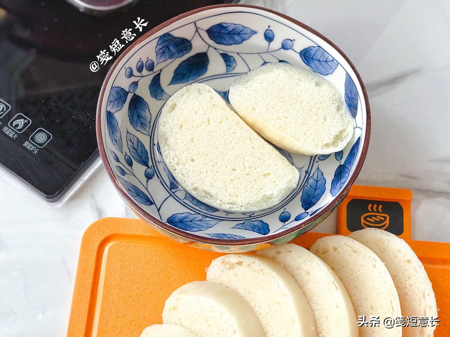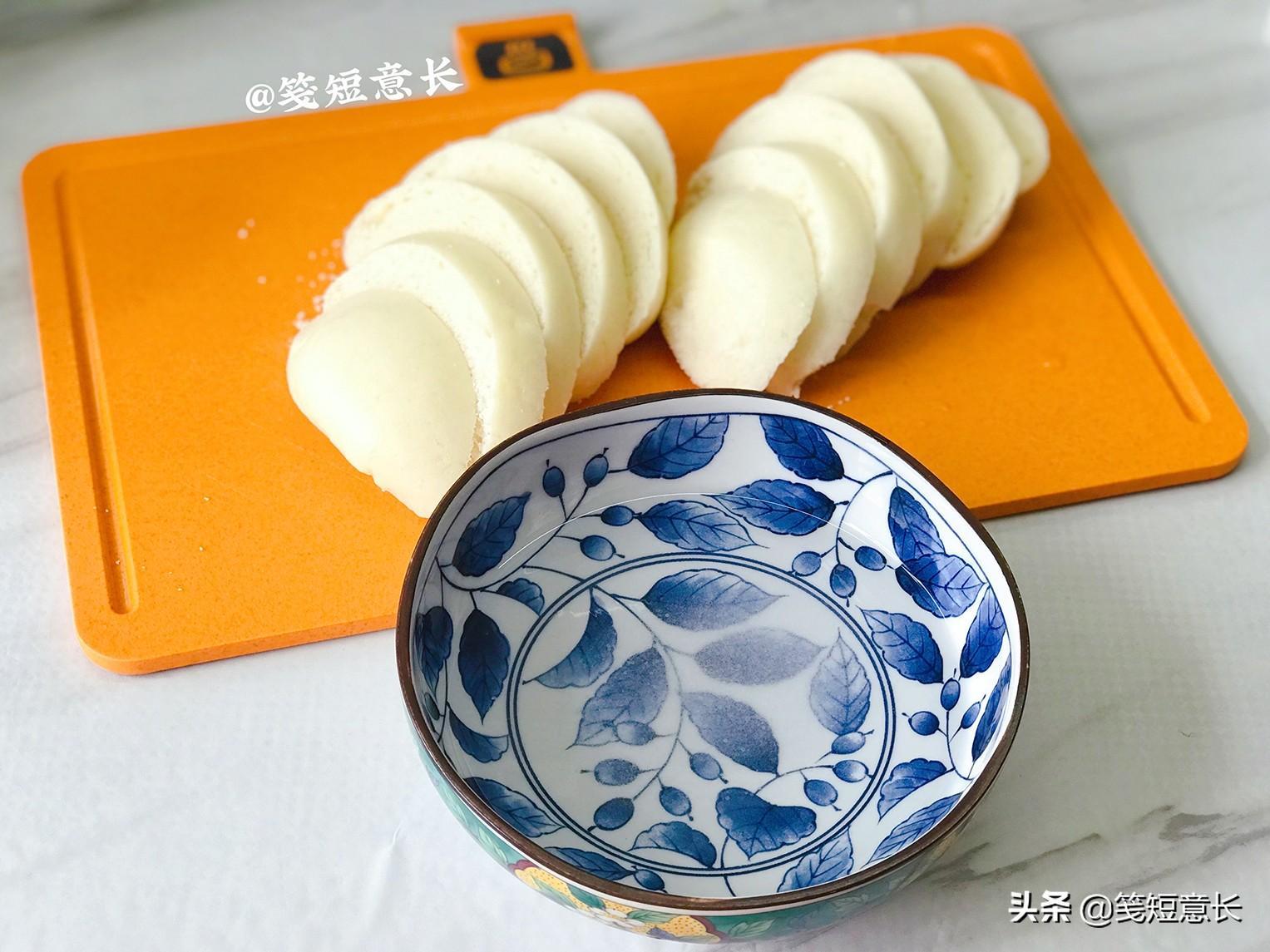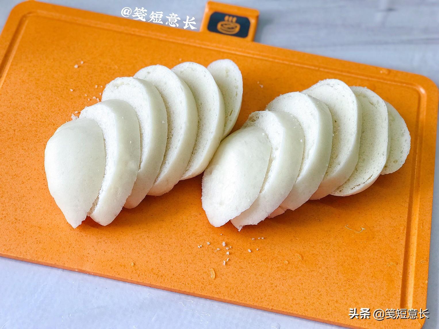 1、将准备好的2个剩馒头切成2厘米厚的馒头片,这里有个小窍门就是馒头凉了之后由于水分缺失会很干,直接切片特别容易掉渣儿,甚至馒头片直接碎裂,切馒头片时把刀放到水龙头下冲一下,再用湿了表面的刀再切馒头片几乎就不会掉渣了。