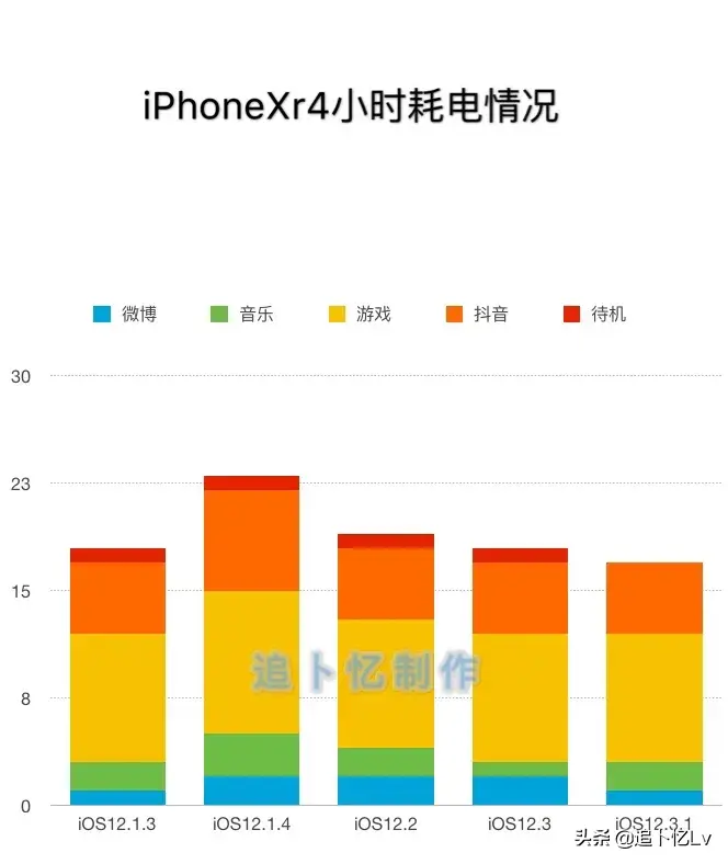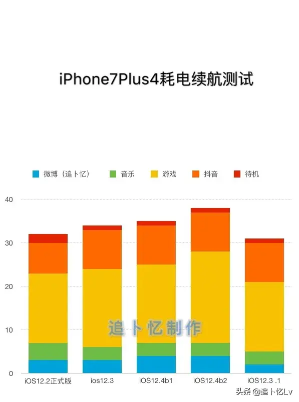 1、本次采用四小时的续航测试,测试项目为微博、音乐、游戏、抖音、关屏待机。其中关屏待机的测试为2个小时,其他四个测试项目均为半小时。关闭自动亮度调节,并用Siri将亮度调节到50%,音量也调节到百分之五十。(表格已柱状图呈现,柱体越高代表耗电量越大,柱体越低耗电量越小。)