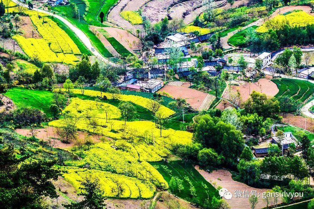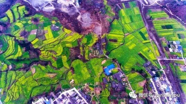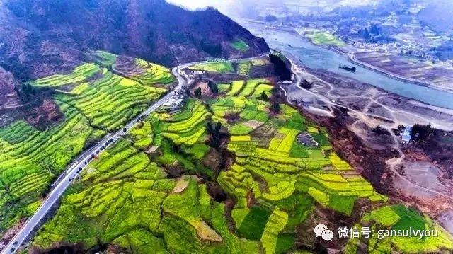 生机盎然的春天,文县碧口一带万亩油菜花已盛开,从空中俯看,长满油菜花的地块金光灿烂,长满小麦的地块碧绿如玉,形成了色彩鲜明、线条优美的奇妙美景。