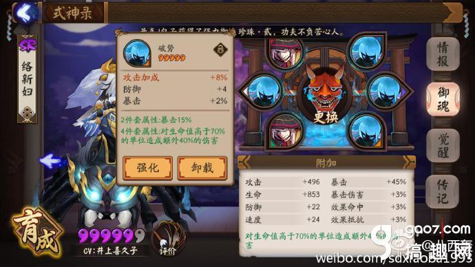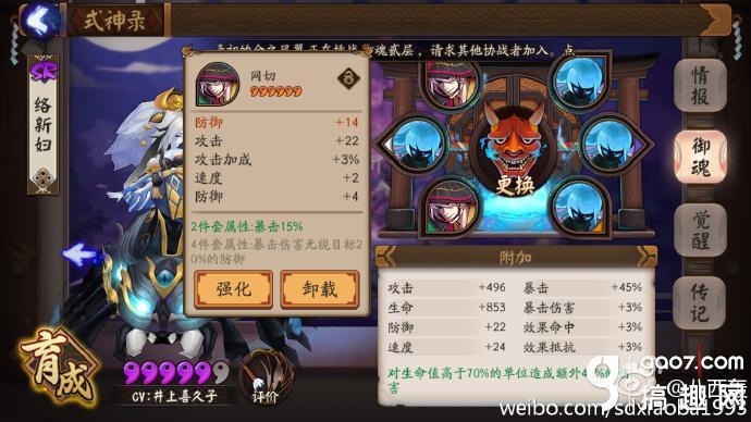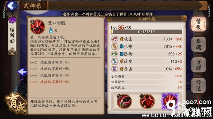 觉醒面板 攻击速度暴击3S 生命防御2B 觉醒后额外添加10%的攻击属性 速度觉醒后是112 输出式神的速度一般都是110上下 络新妇有着非常好的攻击面板 虽然比较脆 但是有着相当高的输出 绝对能和SSR媲美