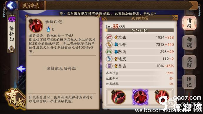注意 这个印记比较难发现 因为是黑色的 而且很小 不像其他的debuff比较明显 所以被络新妇打了之后要注意看看式神周围有没有一只黑色的蜘蛛转来转去……我就是被坑过 还有!这个被动技能造成的伤害 是可以按暴击算的!因此这个技能围绕着蜘蛛的2个重要属性 攻击和暴击展开