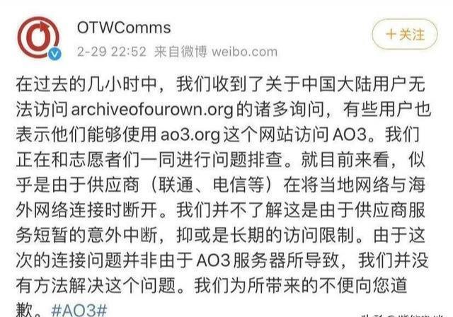 2月29日晚,AO3网站在中国被墙,这一天成为许多人的历史难忘时刻。这也是国家净网第一日。