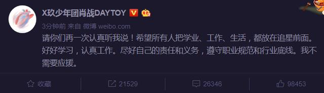 而他也在微博呼吁大家不要“应援”:“请你们再一次认真听我说!希望所有人把学业、工作、生活,都放在追星前面。好好学习,认真工作,尽好自己的责任和义务,遵守职业规范和行业底线。我不需要应援。”