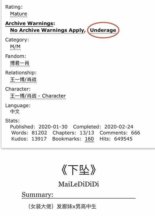 这一切事情的起因,是肖战唯粉,在微博上看到某大v(CP粉)转载了一篇来自lofter的同人文学。其无意中看到肖战的形象,被用来进行同人文学作品《下坠》的创作。