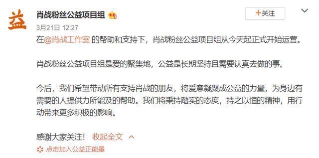 肖战粉丝公益项目再次发表微博,称:肖战粉丝公益项目组是爱的聚集地,公益是长期坚持且需要认真去做的事。