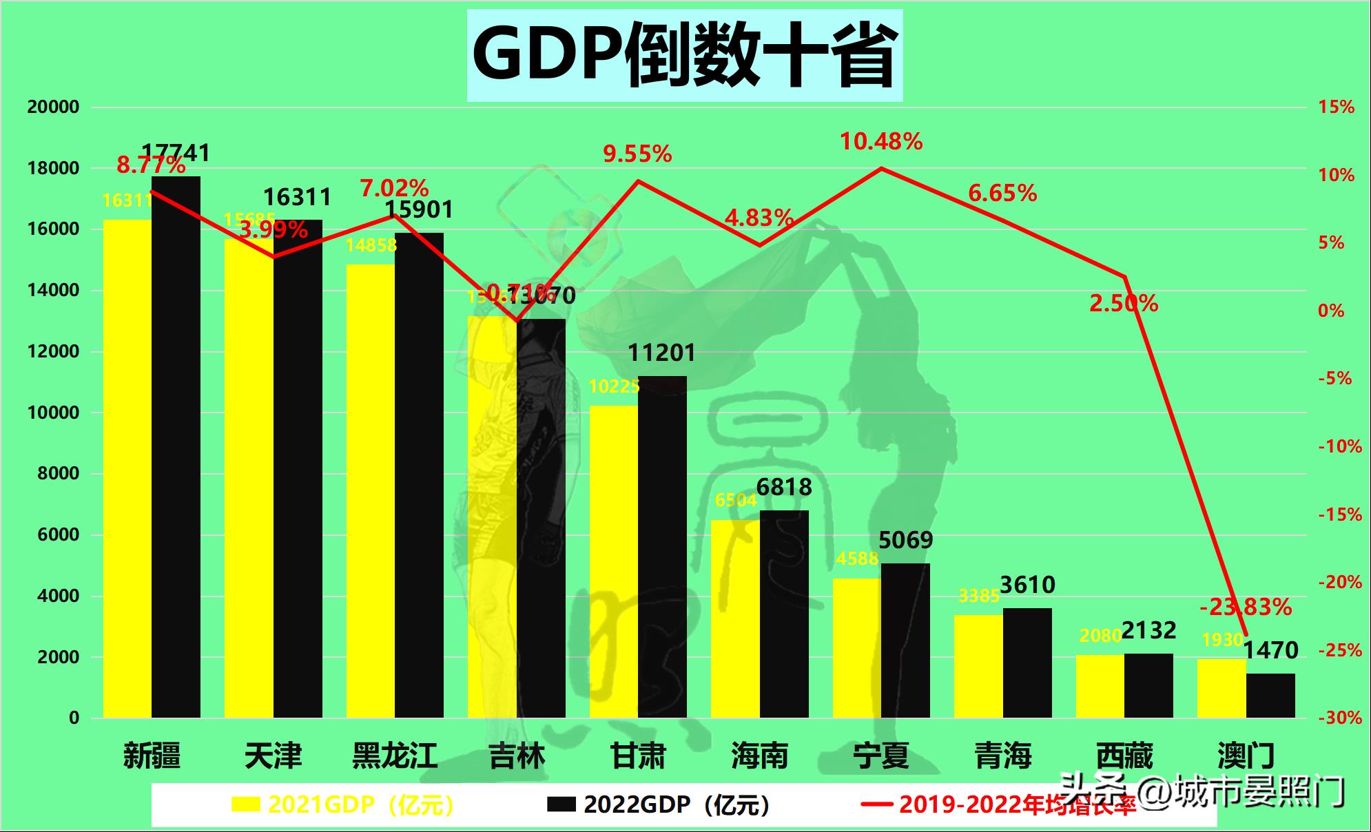 处于我国34省倒数前十的成员中,虽然来自于沿海地区的仅有天津、海南、澳门三省市,但受疫情影响,短短三年GDP便缩水超一半的澳门,则是直接被宁夏、青海、西藏相继超越,成为我国唯一低于0.2万亿的省份。和同处于下游的新疆,足足相差了12倍之多。不过,由于新疆无论是在面积上,还是人口上,都是澳门的几十甚至几万倍,因此,澳门在GDP上无法和新疆相提并论也就不足为奇。反观面积仅次于新疆的西藏,GDP同样是和新疆相差了8倍有余。而人口比新疆还多的黑龙江,则是被地处西部边陲的新疆成功反超,不仅如此,略显老骥伏枥的黑龙江和吉林,还即将被甘肃反超。