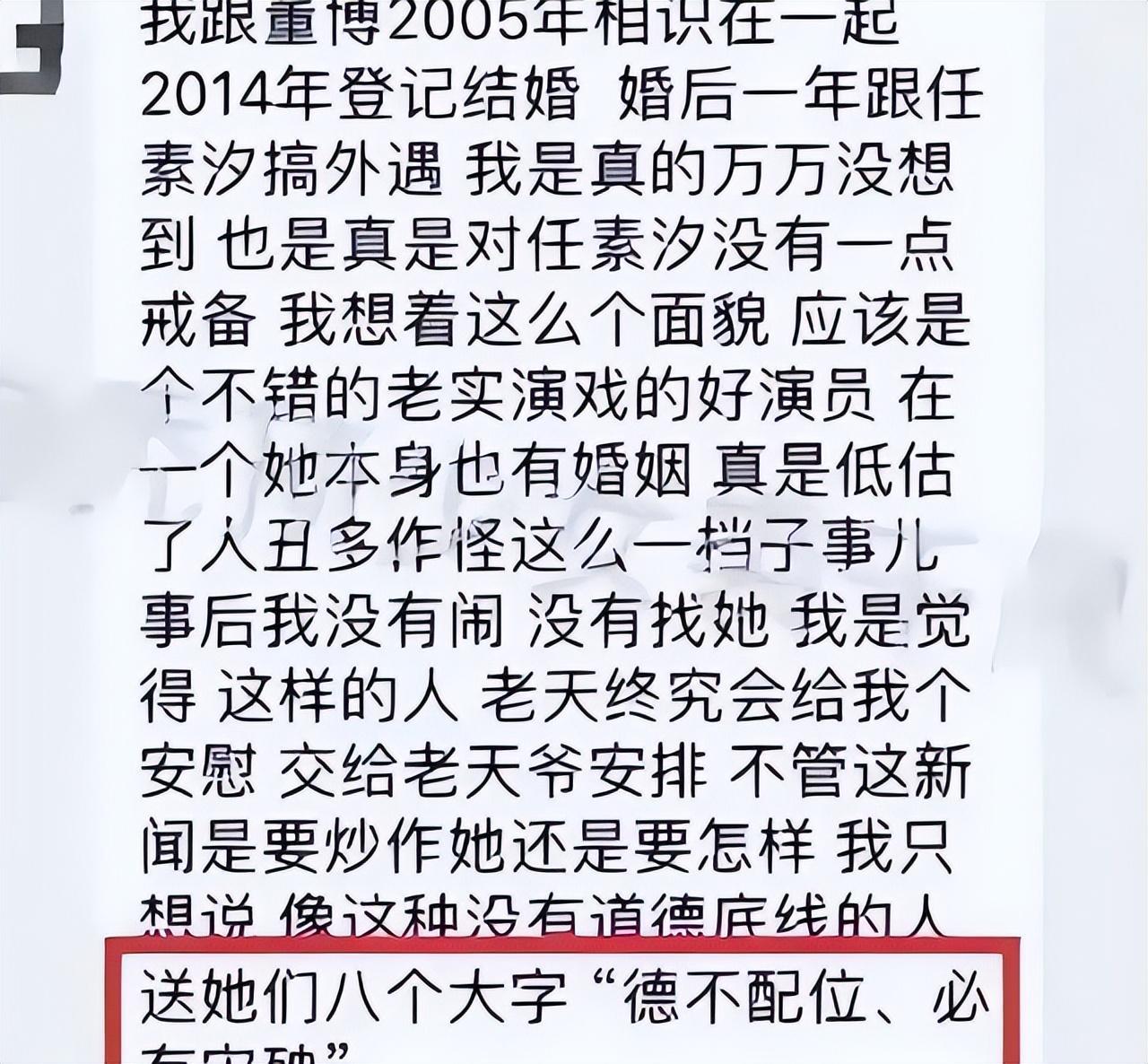 虽然有人爆料,但大家对这件事还怀着半信半疑的态度,直到董博的妻子亲自下场实锤,称任素汐插足了她的婚姻,还说任素汐德不配位。
