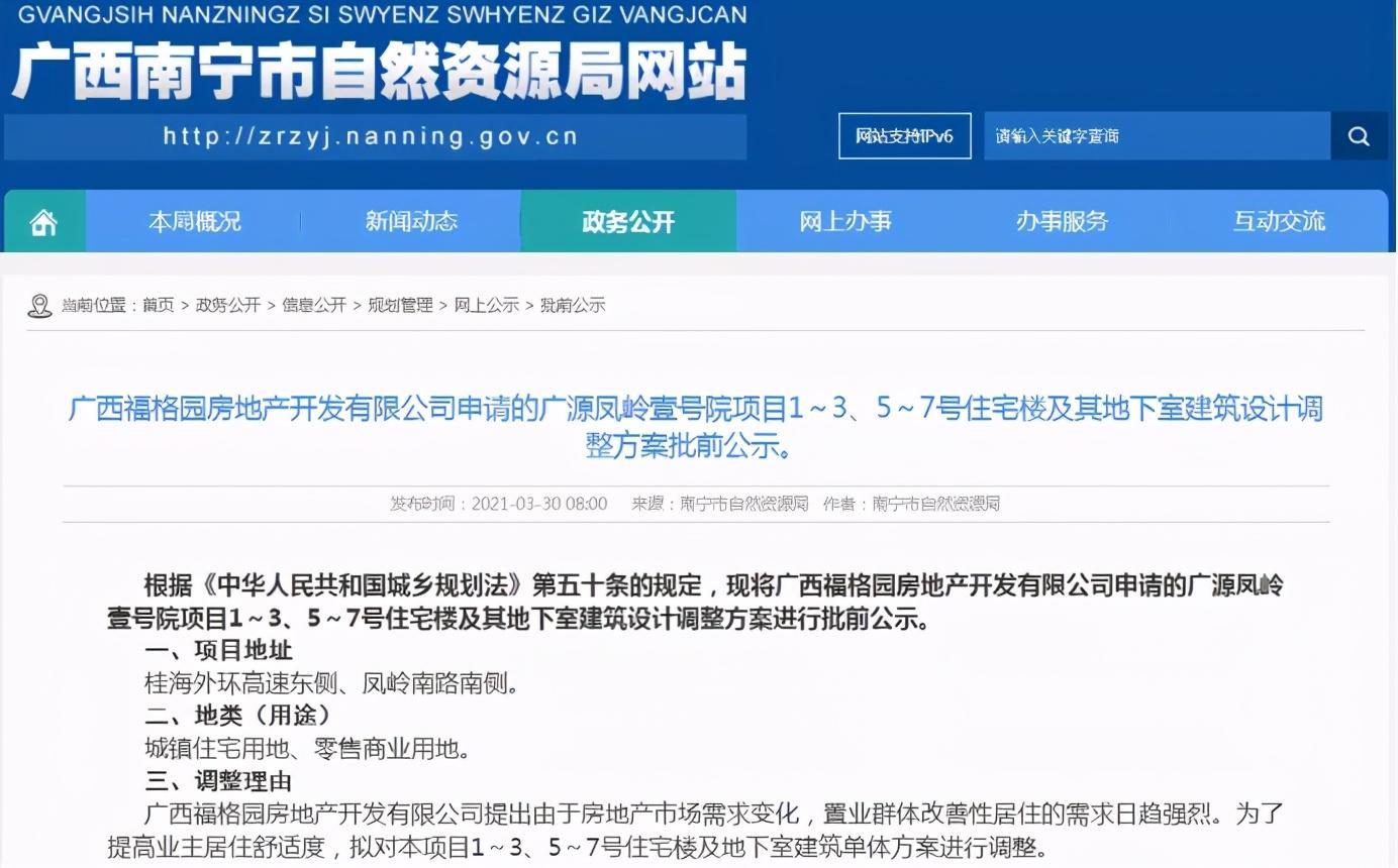 3月30日,南宁自然资源局发布了《广西福格园房地产开发有限公司申请的广源凤岭壹号院项目1~3、5~7号住宅楼及其地下室建筑设计调整方案批前公示》(以下简称《公示》)。