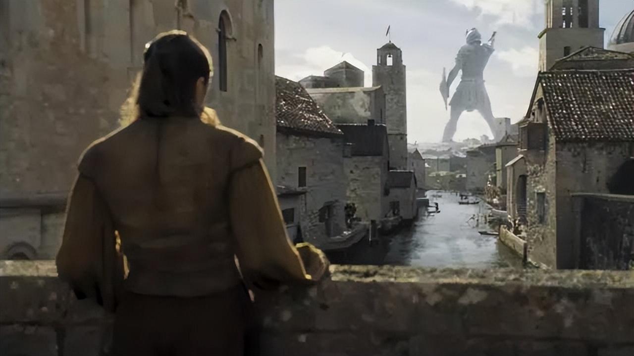 而且在权游中还有一幕镜头出现了巨人像,在史塔克家族的二丫乘坐前往布拉佛斯的船只,寻找贾坤,希望成为无面者的旅程中。