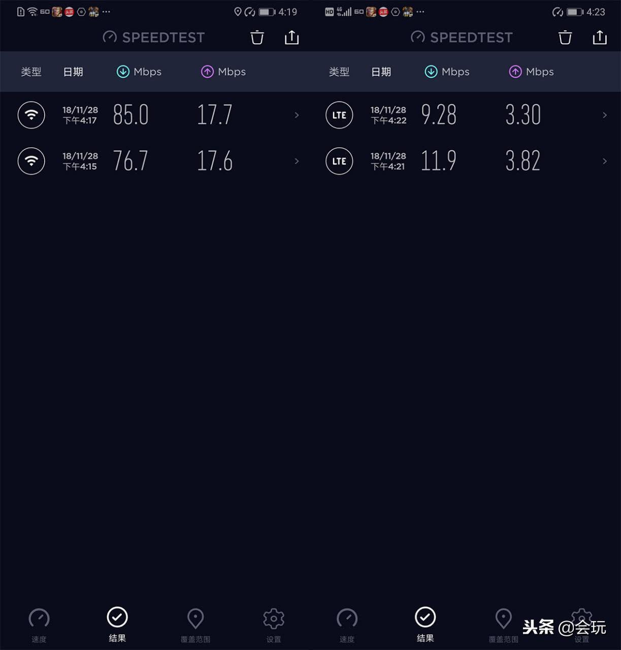 从实际体验来看,Mate 20 的速度表现令人惊喜。使用中国移动4G网络时,多次实测最高下载速度为11.9Mbps;在带宽为100M的WiFi环境下,Mate 20 最高下载速度85Mbps,上传速度17.7Mbps。总体来看,Mate 20比一般手机的下载、上传速度更快,此外Mate 20系列支持双卡双4G双VoLTE,两张SIM卡可同时保持通话,卡1来电时不会影响卡2来电接听或数据流量。