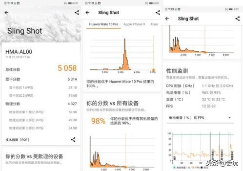 在GPU方面麒麟980启用了更为强大的ARM Mali-G76,共有十个核心,频率为720MHz。麒麟980 G76 MP10在图形性能大幅提升,幅度达46%,再加上GPU Turbo的独家优化,可强化在游戏中的表现。从我们在3DMARK的实测结果能够看到,搭载麒麟980处理器的Mate 20物理测试CPU的性能分数明显优于其他设备。
