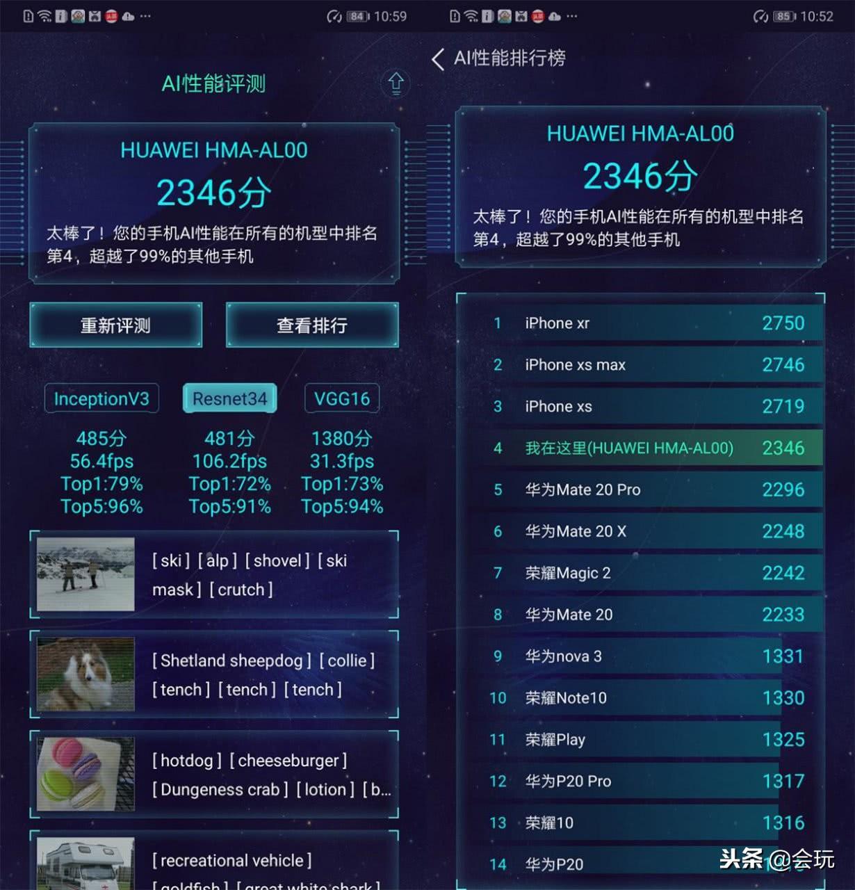 因为麒麟980升级使用了双核NPU(神经元网络处理器),相比前代实现更强劲的手机端AI算力,支持更多超乎想象的AI应用场景,能够实时学习帧率、流畅度和触屏输入变化,预测手机任务负载,动态智能感知手机使用过程中存在的性能瓶颈,及时进行调频调度,带来更流畅的使用体验。通过鲁大师AI测评软件可以看出,搭载麒麟980的华为Mate 20 AI性能跑分为2346,跑分排行在安卓智能机领域名列前茅。