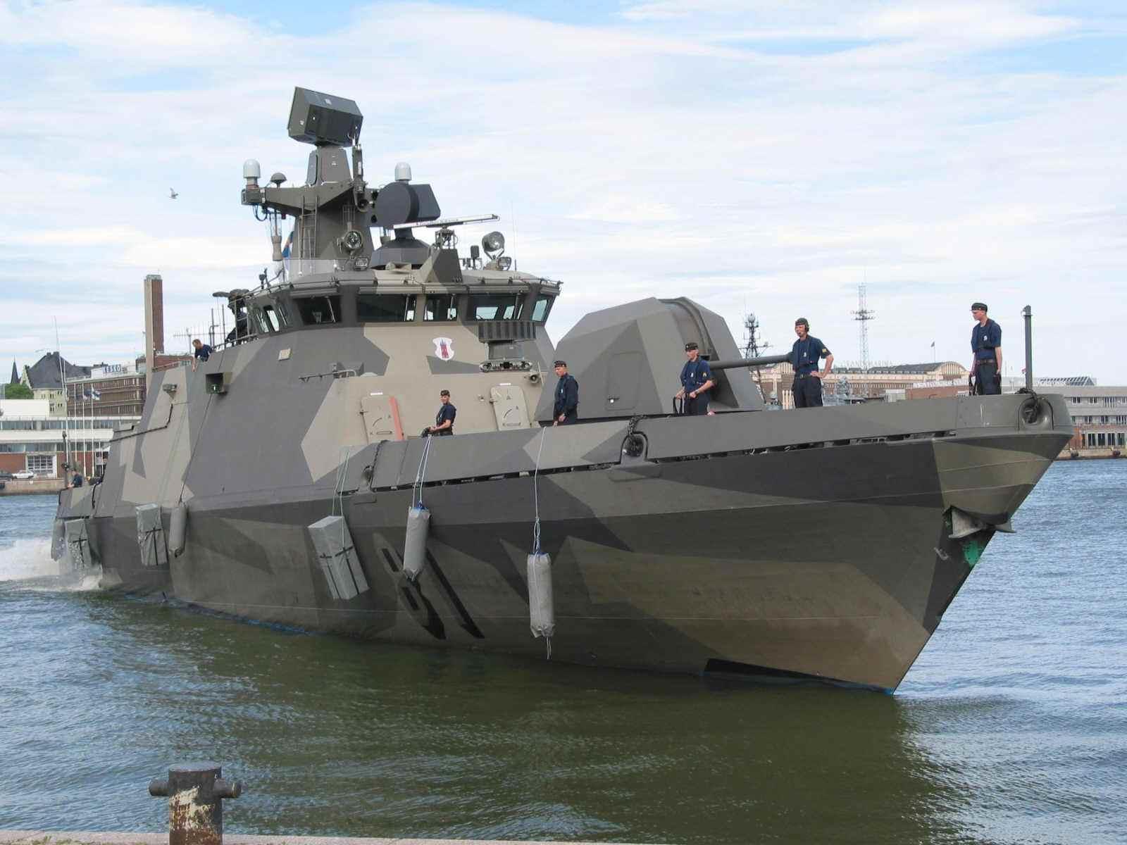 芬兰海军在上世纪90年代提出了“2000编队”的规划,采购了四艘隐身导弹艇,即为哈米纳级隐身导弹艇。在武器装备上,哈米纳级导弹艇主炮为一门博福斯40毫米速射炮,反舰方面为2座双联装萨博公司的RBS-15 Mk3型反舰导弹(射程150km,速度0.8马赫),防空方面则采用了1部南非制八联装Umkhonto(矛式)垂直发射舰空导弹系统(速度2.5马赫,射程12千米),同时还有4座9联装萨博公司的E1MALLS-920型反潜火箭发射装置来执行基本的反潜作战任务。