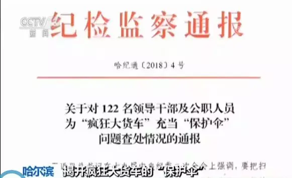 通过7个多月的调查,6月25日,哈尔滨市纪委监委发布通报:针对这122名为疯狂大货车充当“保护伞”的领导干部、以及公职人员,其中11人移送司法机关依法处理,111人分别受到党内严重警告等处分,有的予以免职。