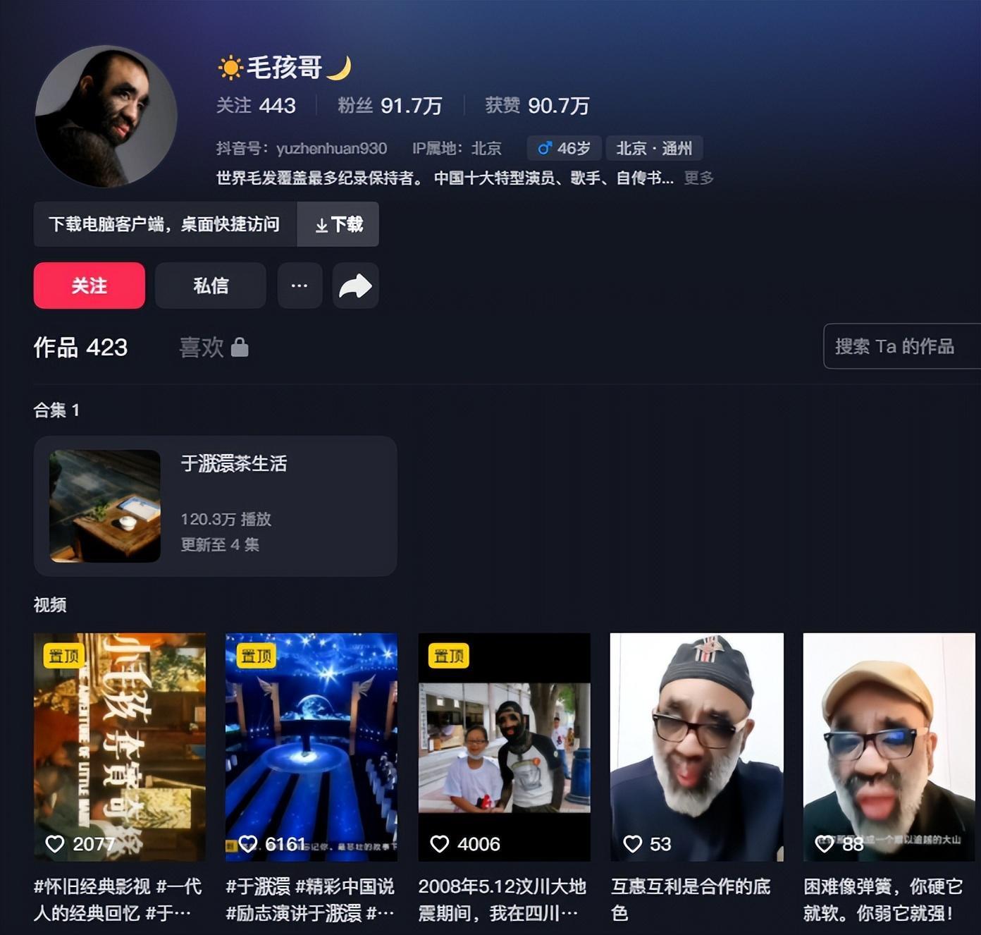 可是于震寰觉得正是身上的毛发给他带来了事业,带来了爱情和这一切。