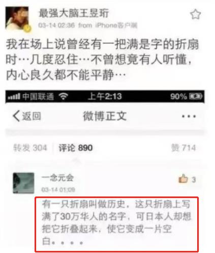 此后王昱珩也在微博上转发了网友的解说,他所说的这把扇子叫做历史,上面写满了30万人的名字,但有些人却想把它合起来变成一片空白。