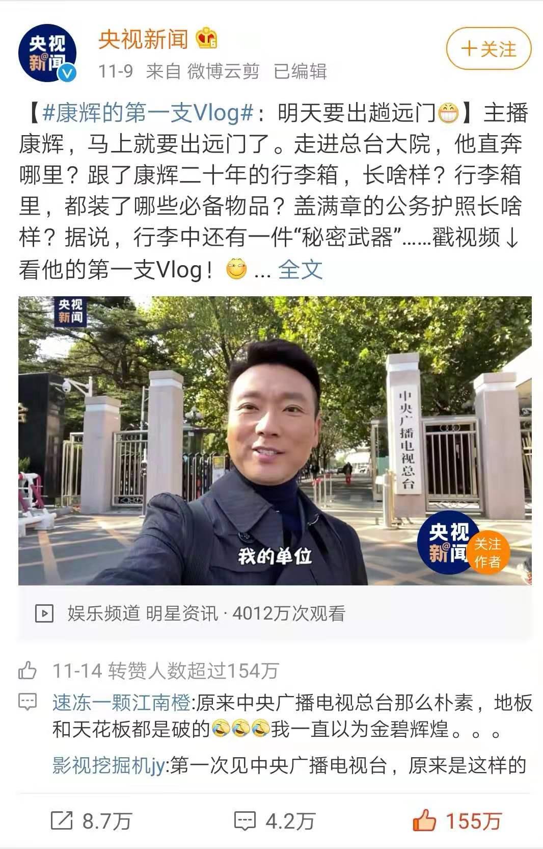 11月9日,康辉在微博上po出第一个vlog,在短时间内,有超过 100万人点赞,转发8.3万,评论3.9万,鲜有亮相的中央电视台幕后,康辉的化妆包、公务护照、旅行箱都成为大家讨论的重点。