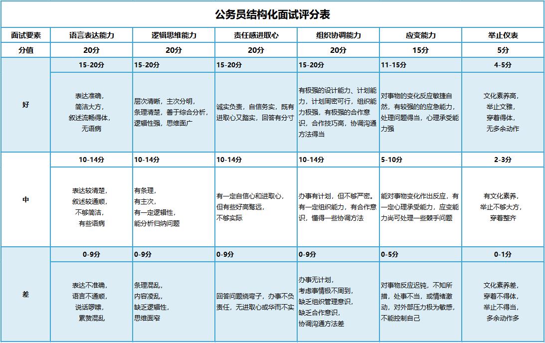 面试目的和公务员思维是“战略”,落到实地还是需要“战术”,学习战术最直接的方法就是对标面试评分表当中“好”的那一栏,比如这个: