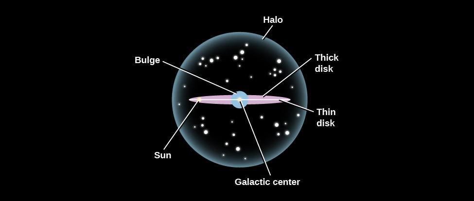 Bulge:中央凸起;Halo:银晕; Disk:银盘;Galactic center:星核