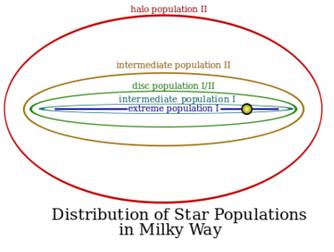 我们可以粗略地把银河系中的恒星分为两类。年代久远且重元素很少的恒星被称为星族Ⅱ,存在于银晕和球状星团中。星族Ⅰ比星族Ⅱ拥有更重的元素,以及连续的金属丰度和稳定的轨道形状,它们通常更年轻,排列在银盘中,尤其集中在旋臂中。
