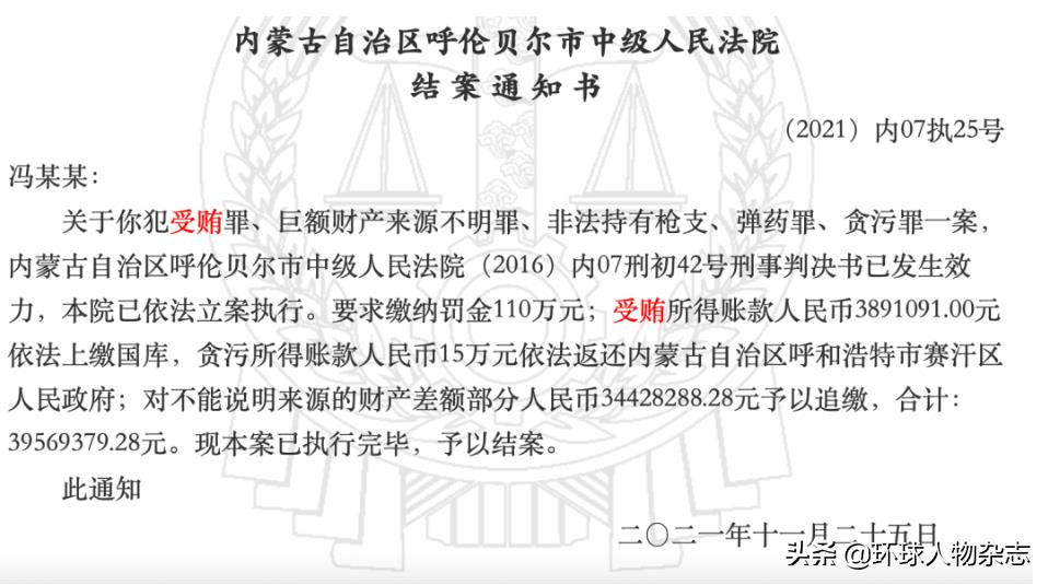近日,中国裁判文书网公布了一份《冯某某其他案由首次执行执行通知书》。通知书显示,内蒙古自治区呼伦贝尔市中级人民法院对冯某某犯受贿罪、巨额财产来源不明罪、非法持有枪支、弹药罪、贪污罪一案已执行完毕,予以结案。