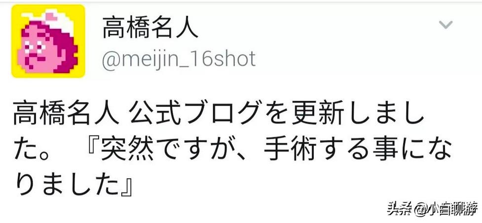 但毕竟岁月不饶人,在今年的6月,高桥名人在个人博客中宣布了一件让不少人惋惜的消息:他当年为之自豪的右手将在7月接受手术,因为在此之前,高桥名人深受肌腱病变的影响,曾经能一秒敲下16次手柄按键的“神之手”饱受病痛折磨,最严重的时候甚至只能用左手操作电脑键盘。