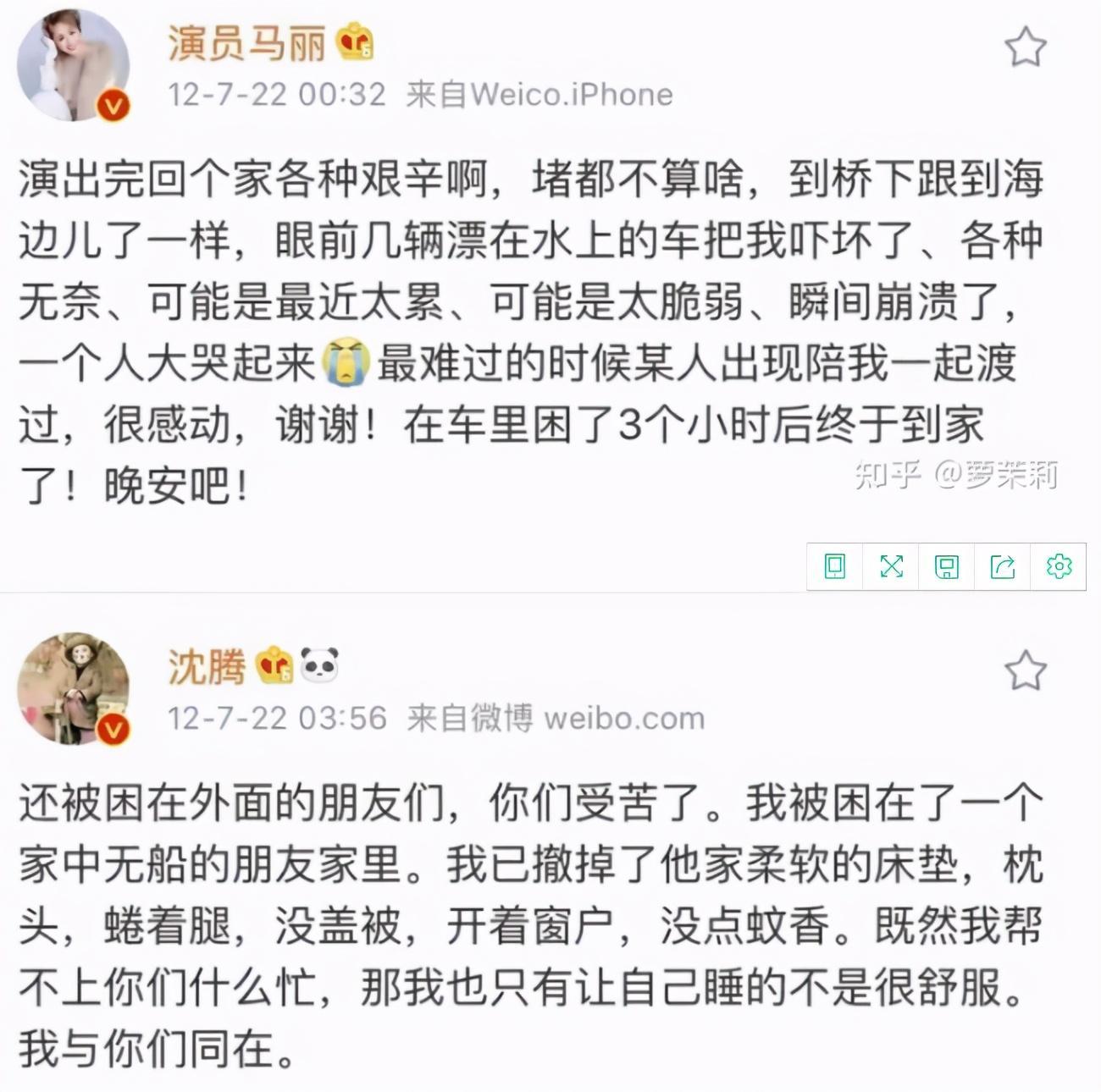 2012年7月22号凌晨,北京下起了大雨,马丽被困在车上三个小时回不了家,是沈腾陪伴守护她,不让马丽崩溃。