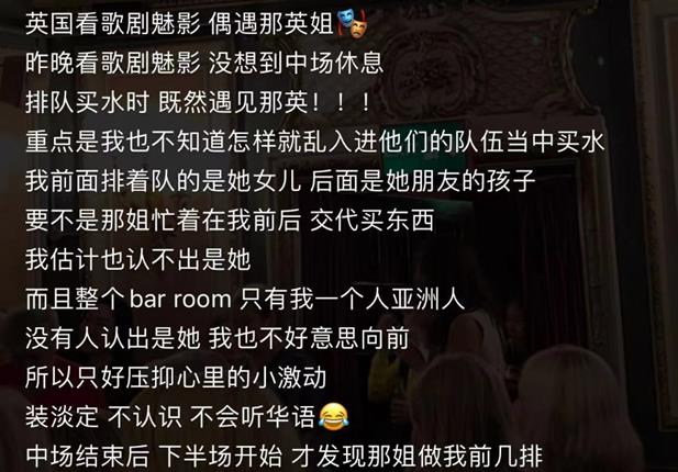 根据网友提供的线索,观看欣赏歌剧《魅影》的现场,在歌剧中场休息期间,该网友排队买水的时候,偶遇那英,并认出了她。当时除了那英以外,还有她的女儿小苹果、那英的朋友及其朋友的女儿也出现在了歌剧现场。