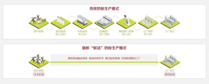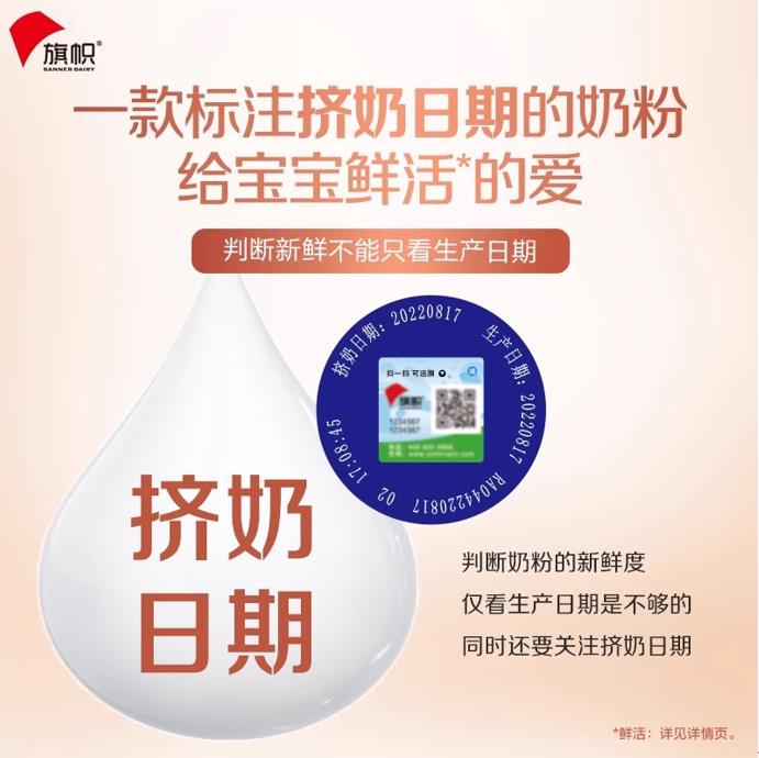 从生产技术上看,旗帜帜亲“鲜奶密闭输送系统”获得国家专利技术[2],新鲜牛乳仅需98秒即可完成从挤奶到开始加工[3],保留更多天然活性蛋白,其罐底的挤奶日期也是生产日期,奶粉新鲜看得见,让妈妈买得放心。