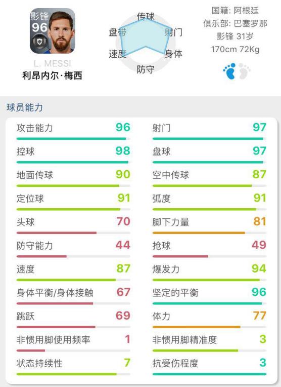 在《实况足球》手游里,梅西的能力可以说是相当恐怖,这从他超高的球员能力也能看得出来。攻击能力、射门、控球和盘球全部几乎封顶,速度和爆发力也颇高,除了防守方面略显短板之外几乎没有任何弱点。