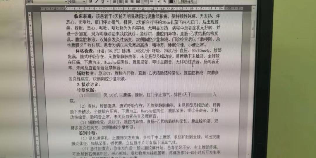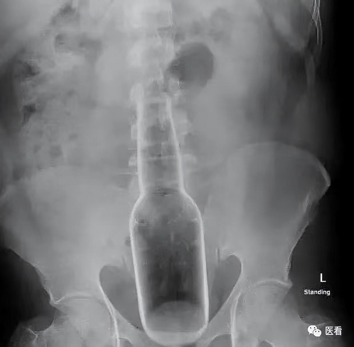 万幸的是,瓶子不算太长(约18cm)、肠子没有捅破、花露水有瓶盖。所以该患者比楼上塞茄子的老哥情况好的太多。