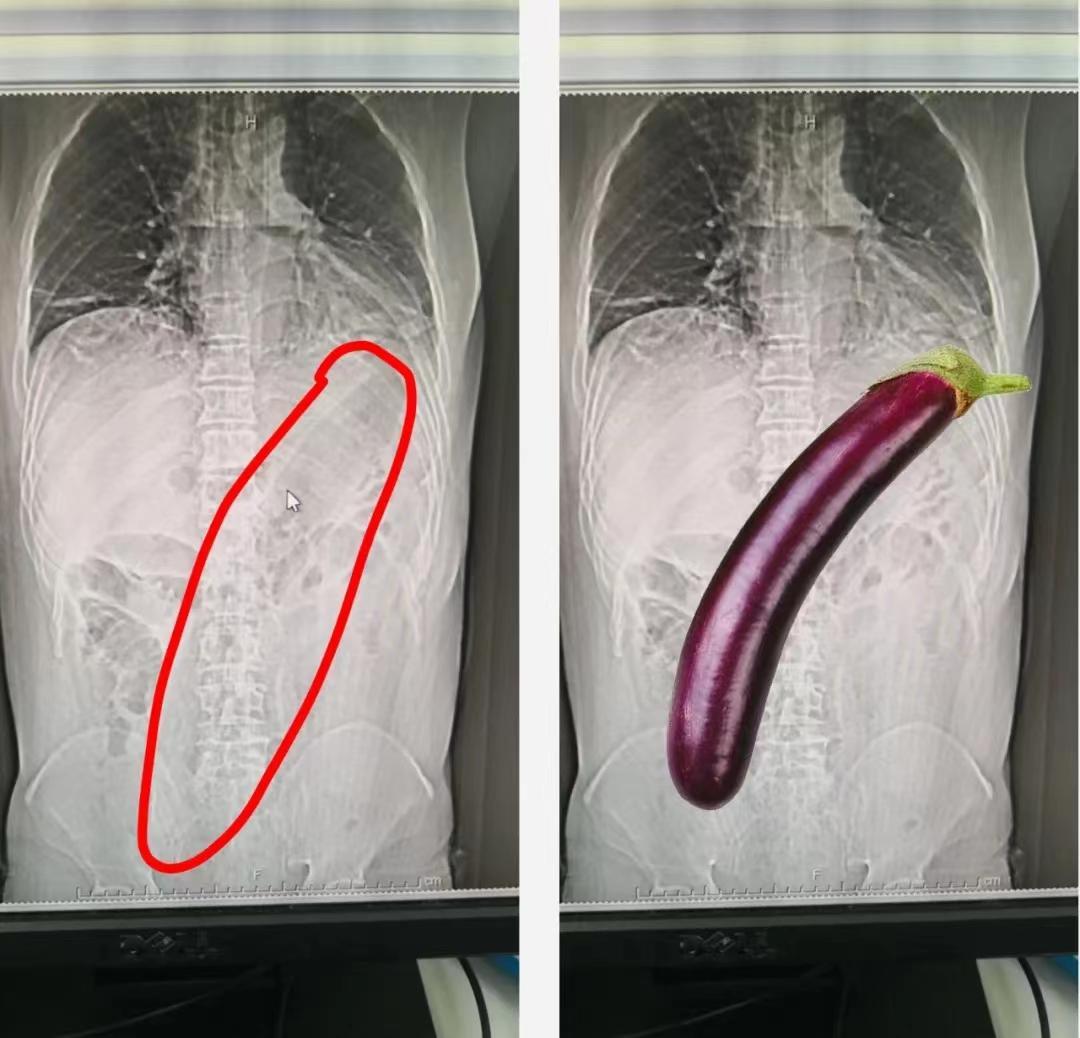 虽然“异物”对咱们影像科来说,已经见怪不怪了,但是这么大的茄子,还是emmmm......