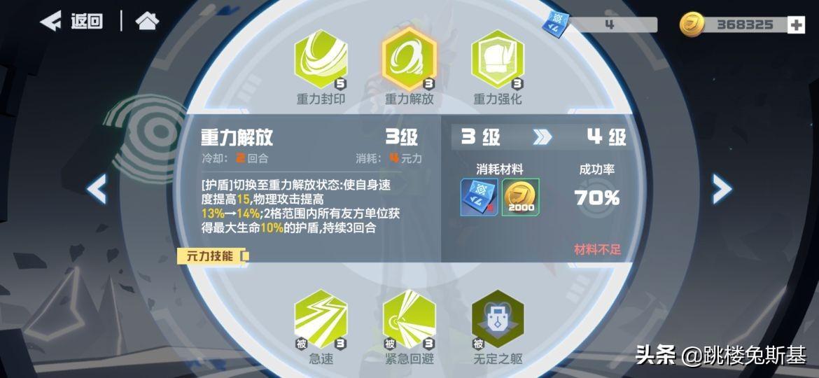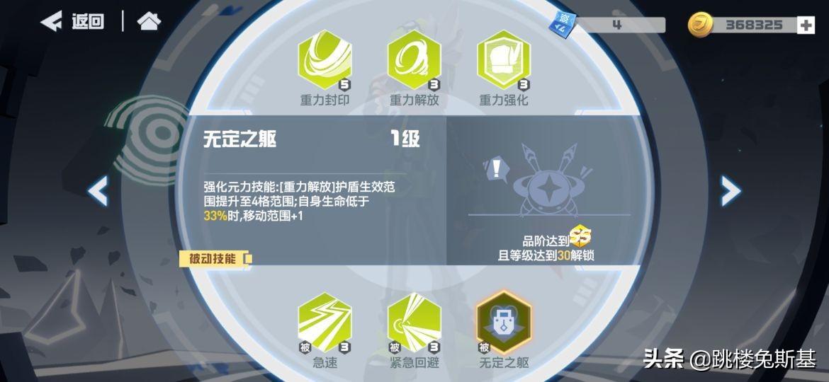 最后的这个无定之躯被动呢,是需要品阶达到双s才解锁。技能效果为增大重力解放生效范围,自身生命低于一定值是,移动距离加一。