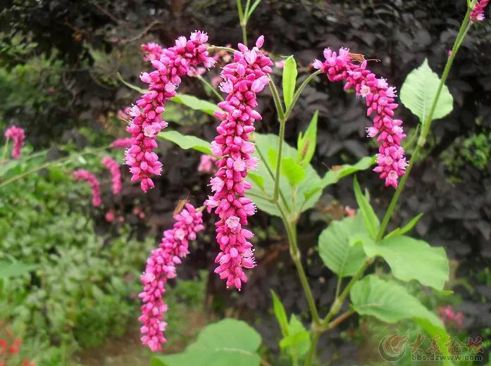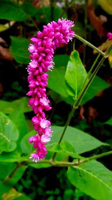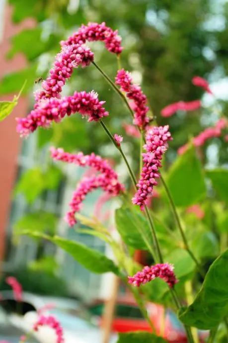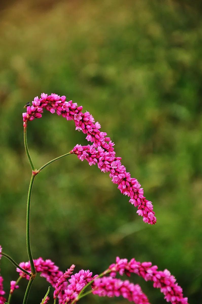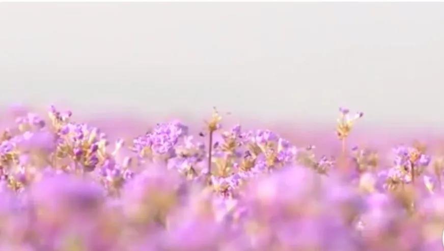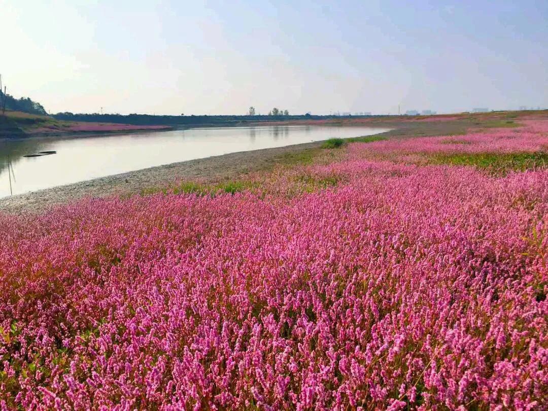 紫红色的蓼子花与远处的湖水相交辉映。宛如一幅美丽的画卷,仿佛回到了春暖花开的季节。