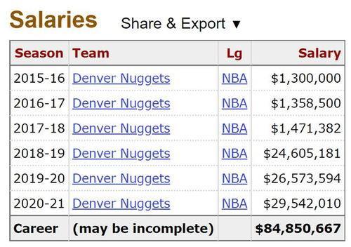 2018年夏天,约老师的新秀合同到期。掘金队为了留住这位年轻的超级巨星,给他提供了一份5年1.48亿美元的顶薪续约合同。这份合同使得约基奇的年薪迅速从100万美元跨越至2000万美元。具体来说,他在2018-19赛季的年薪为2546万美元,2019-20赛季的年薪为2743万美元,2020-21赛季的年薪为2940万美元,2021-22赛季的年薪为3137万美元,2022-23赛季的年薪为3248万美元。在这个时期,约老师实现了背靠背MVP的壮举,展现出了他在球场上的才华。