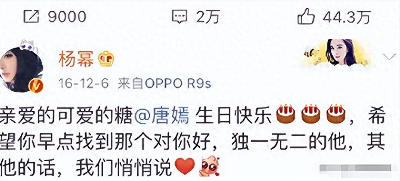 随后几年,她们时不时同台亮相,给外界塑造了好姐妹的形象。 2010年杨幂生日那天,唐嫣在微博送上祝福称两人是最好的朋友。