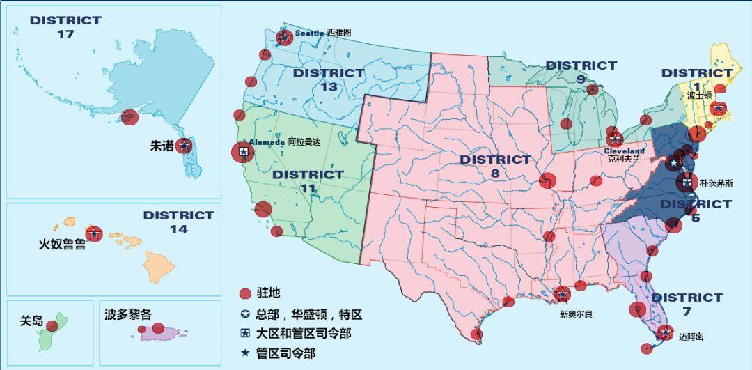 美国海岸警卫队划分为两个大区,即太平洋区和大西洋区。在此基础上划分为9个管区。大西洋区的管辖海区共有五处,覆盖美国东岸、五大湖和墨西哥湾。太平洋下辖四个管区,包括美国西海岸和太平洋。