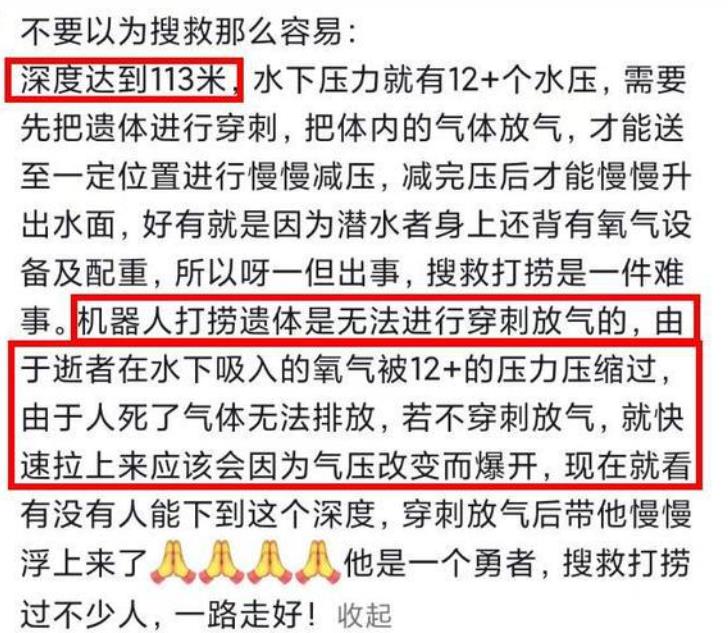 一位专业人士也透露无法打捞的原因,是因为深度达到了 113 米,水压太高。需要先把遗体进行穿刺,将体内的气体放出。之后才能将遗体送至一定位置慢慢减压,减完压之后才能慢慢升出水面。若不穿刺放气就快速拉上来,遗体会因为气压改变而爆开。