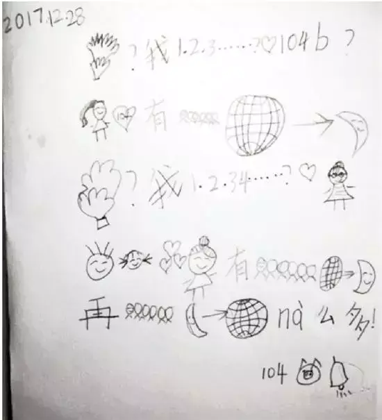 (猜猜我有多爱 104 班?我爱 104 班有从地球到月亮那么多。猜猜我有多爱程老师?我爱程老师有从地球到月球,再从月球走回到地球那么多。落款是“104 班朱琳”)