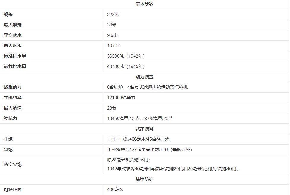 炮塔装甲防护:主炮有着良好的装甲防护,炮塔的面板为406毫米厚,侧面为247.5毫米厚,后部为295毫米厚,顶部为175毫米厚。127毫米和弹药舱均由48.75毫米的特制钢板防护,可抗御弹片和飞机的扫射。