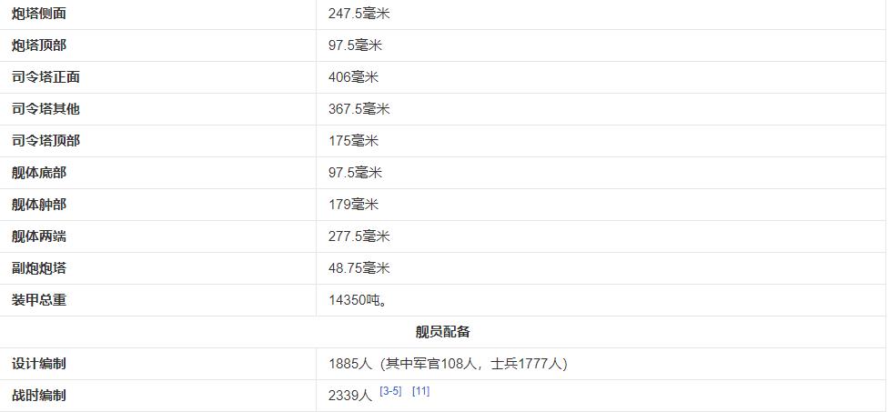 指挥塔装甲防护:其四周装甲厚度为367.5毫米至406毫米,顶部装甲厚度为175毫米,底部装甲厚度为97.5毫米。